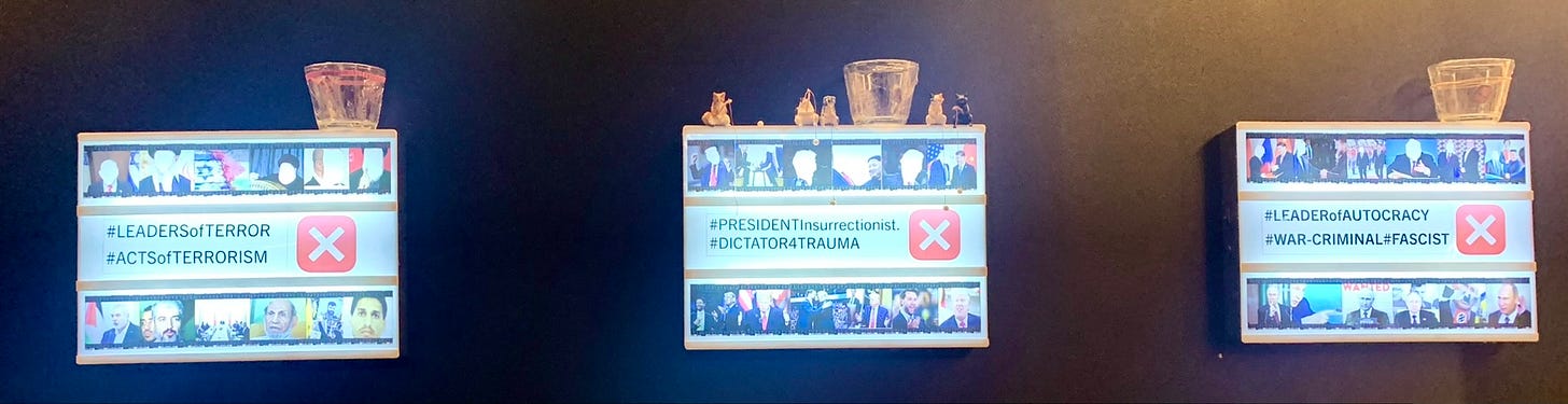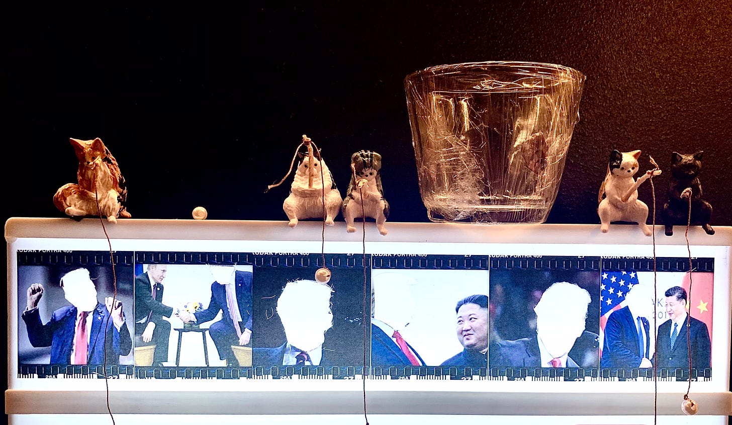 The work embedded in this essay emerges from that recognition. Faces are removed not to anonymise, but to deny the comfort of character-driven reading. Without personalities to anchor blame or fascination, power becomes visible as pattern: repeated gestures, repeated symbols, authority rehearsing itself through form.